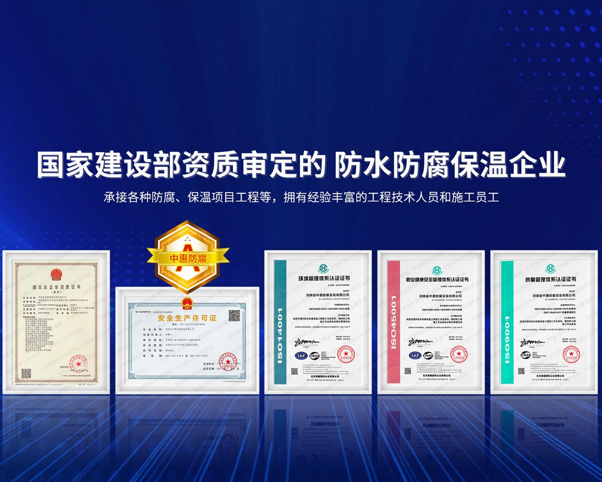 公司經營范圍:防水防腐保溫工程;消防設施工程;建筑裝修裝飾工程;建筑機電安裝工程;電力工程;建筑工程;石油化工工程;工業清洗工程;油罐清洗工程;鋼結構工程;環保工程;模板腳手架工程;電纜防火封堵、防污閃噴涂、外墻外保溫工程;各類施工勞務作業;設備維修、船舶鉚焊、涂裝;電力工程材料、建材、防水材料、防火材料、防腐保溫材料銷售,并相繼通過了GB/T19001-2008idtISO9001:2008GB/T50430-2007質量管理體系認證證書。GB/T24001-2004idtISO14001:2004環境管理體系認證證書。GB/T28001-2011idtOHSAS18001:2007職業健康安全管理體系認證證書。公司是中國防腐蝕于防護協會、中國施工企業管理協會、電力協會和中國鋼結構防水協會會員單位。 公司的經營業務涵蓋了石油、化工、電力、冶金、煤炭、船舶、國防、燃氣、水利、環保、交通運輸、航空及國防軍工和輕紡市政等行業的防腐保溫絕熱設備。鋼結構安裝、防火、防水、金屬噴鍍、聚脲噴繪、陰極保護、防滲透堵漏、玻璃鋼及各種磚版材料襯里、橡膠襯里、煙氣硫和耐酸溶劑腐蝕等工程施工。公司連續十年榮獲“省市先進施工企業”“安全生產先進單位”“重合同,守信用企業”和“AA***資質企業”的稱號。2000年被命名為市級文明單位,2002年被國家工商行政管理局命名為“重合同,守信用的企業”、被中國工業防腐蝕技術協會命名為“防腐蝕企業,能源節約及環境保護領域有豐富的經驗和***的業績。工程一次交驗合格率100%。其中攀枝花鋼鐵公司煉鐵廠四號高爐及熱風爐防腐工程、上海寶鋼公司煤氣柜防腐工程、撫順石油一廠裝置防腐項目、齊魯石化公司稀烴廠高塔防腐工程、吉林化學工業公司煉油廠油罐防腐工程、天津石化熱電廠六號爐頂棚聯絡管保溫工程、大慶油田(太倉)力神泵業工程、中國化學工程第十一建設工程、中原油田勘探局工程、中國石化銷售有限公司華北分部、魯皖輸油管道工程、貴州開磷息烽合成氨工程、陜西黃陵煤化工程、中國石油天然氣西部管道塔里木輸油工程、邯鋼集團邯寶鋼鐵公司煉鐵工程、德州供電工程、吉寶(南通)船廠工程,偃師華潤熱力工程、鄭州熱力總公司。 河南省中惠防腐安裝有限公司愿以豐富的施工經驗,***的技術,***的設備,***的管理,***的服務,竭誠為國內外廣大的用戶提供***滿意、******的工程作品。 我公司愿與國內外同仁一道,團結協作,共同推進防腐蝕行業發展! 公司地址:河南省長垣縣建設路北段360號 固定電話:0373-8866488 郵編:453400 網址:http://www_zhff_com_cn.youxinlicai.com